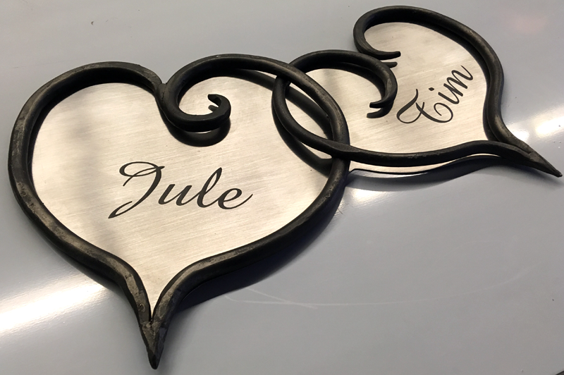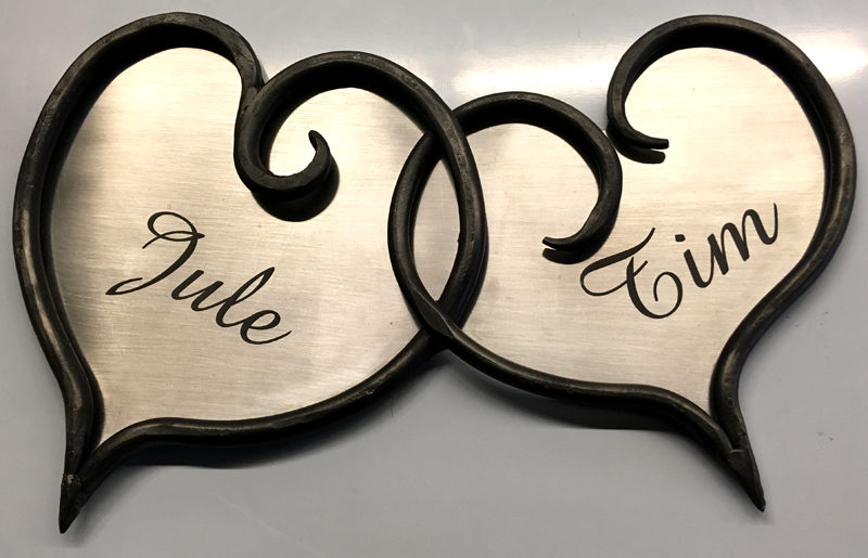 Unsere handgeschmiedeten Herzen u.a. als Hochzeitsgeschenk und für Alle Verliebten. Jedes dieser Herzen ist ein absolutes Einzelstück, direkt aus unserer Schmiede. Gefertigt werden die Herzen aus massivem Rundstahl. Die Namen werden auf einer gebürsteteten Edelstahlplatte für die Ewigkeit eingelasert.