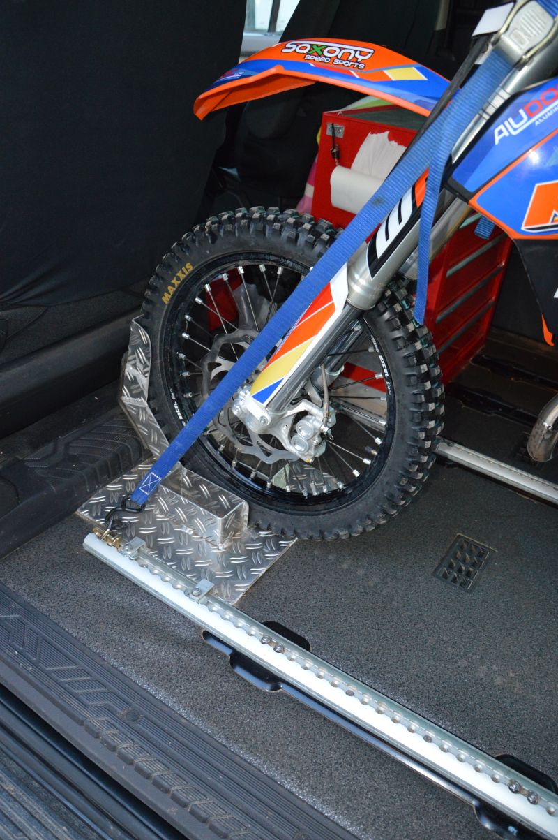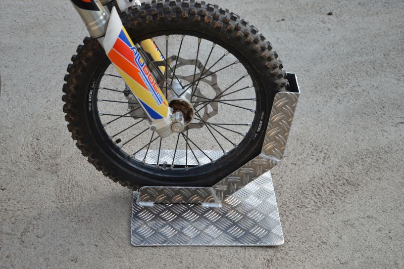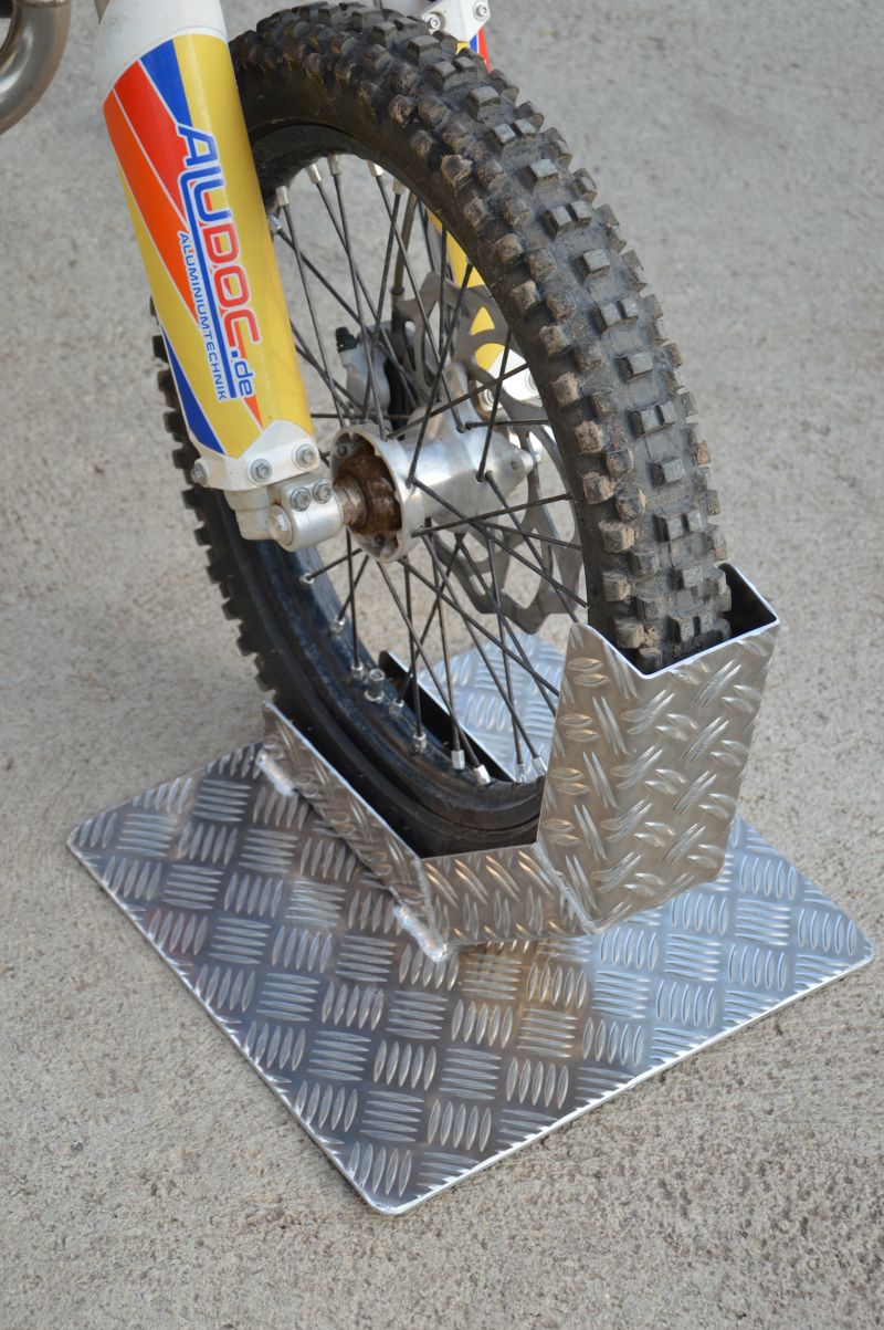 Motorradhalterung für alle Mx Motorräder und Fahrräder im KFZ mit Bodenplatte aus 5mm Aluminiumriffelblech, Größe 400x400mm.